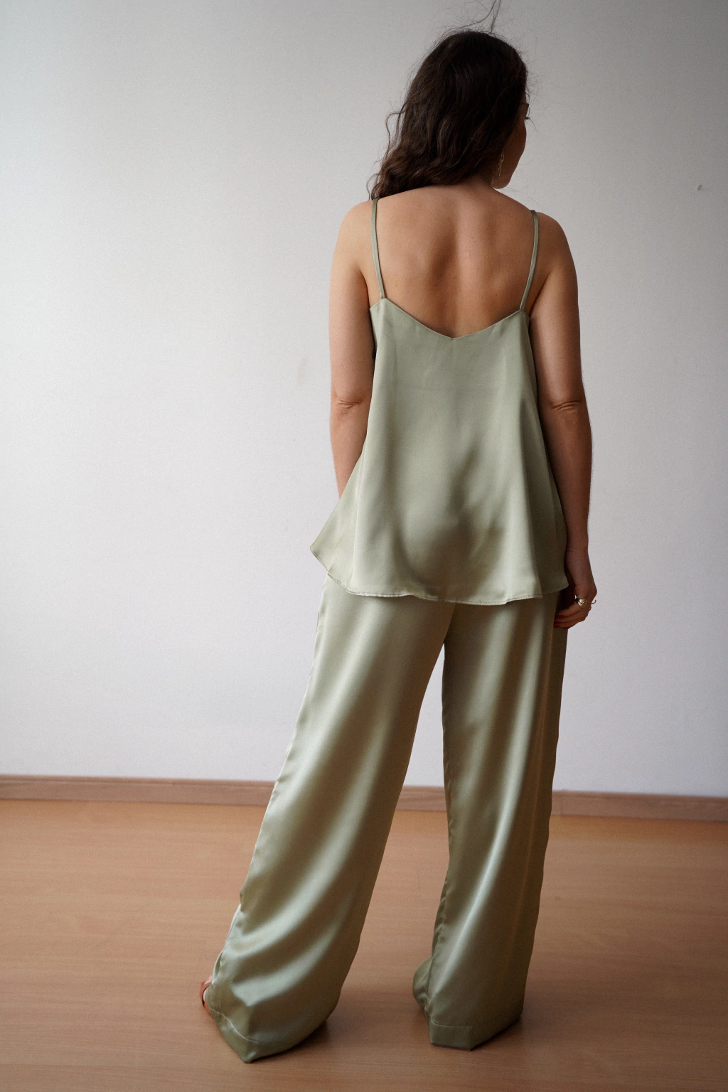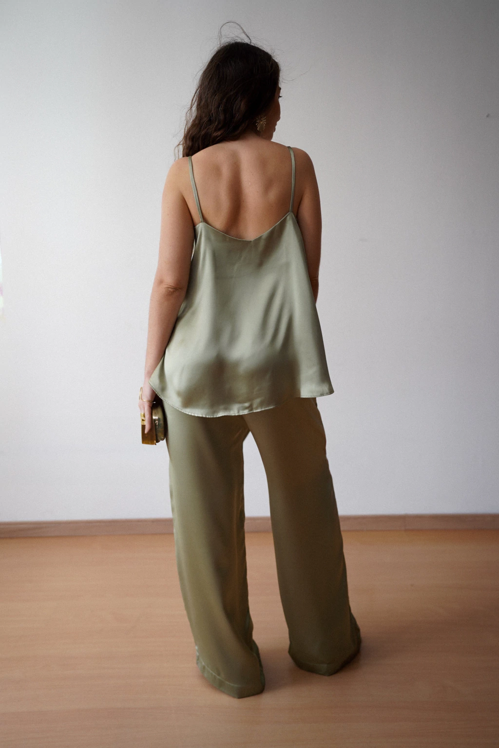Tecido de cetim fluido, com caimento impecável, brilho sutil e toque macio.