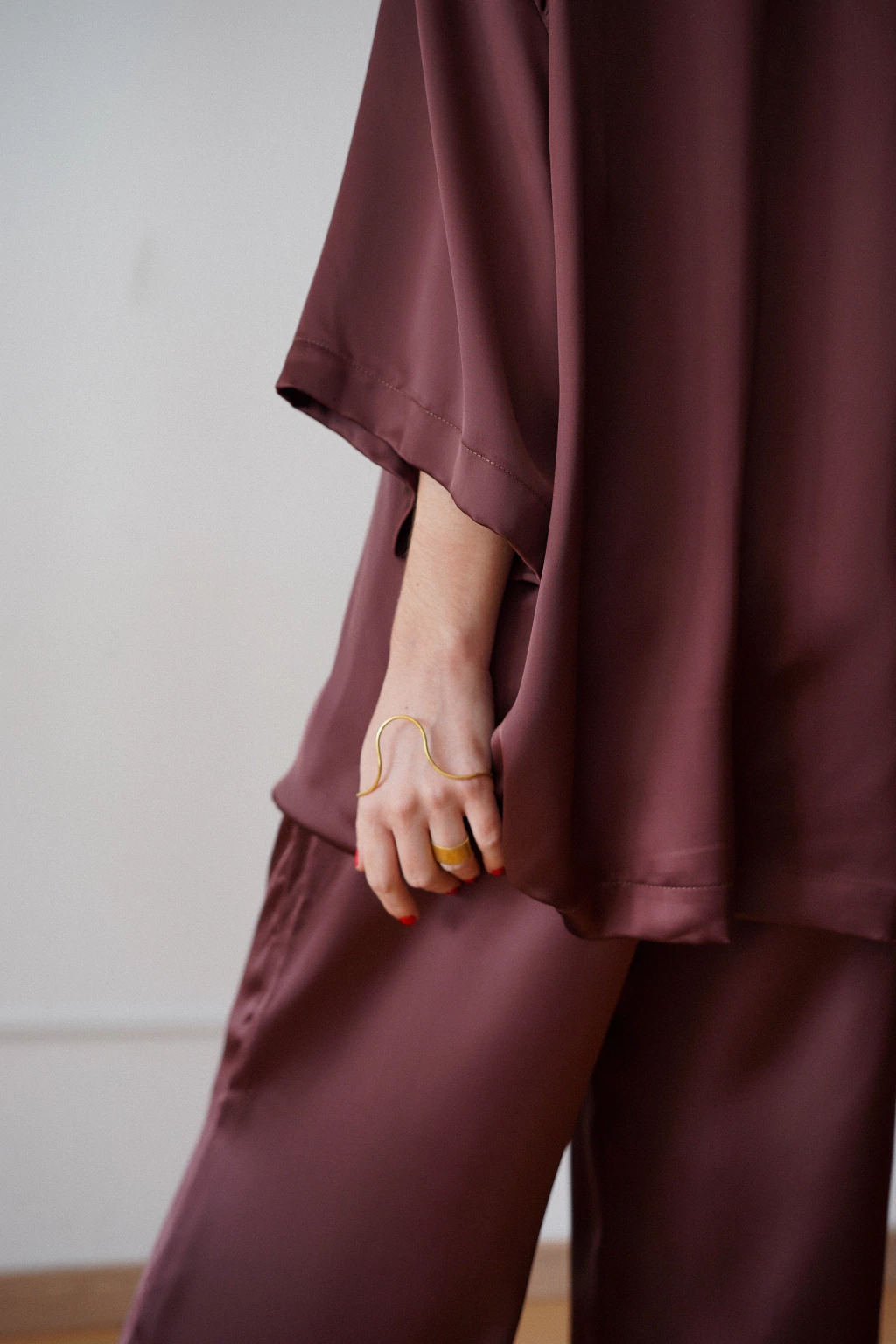 Tecido de cetim fluido, com caimento impecável, brilho sutil e toque macio.