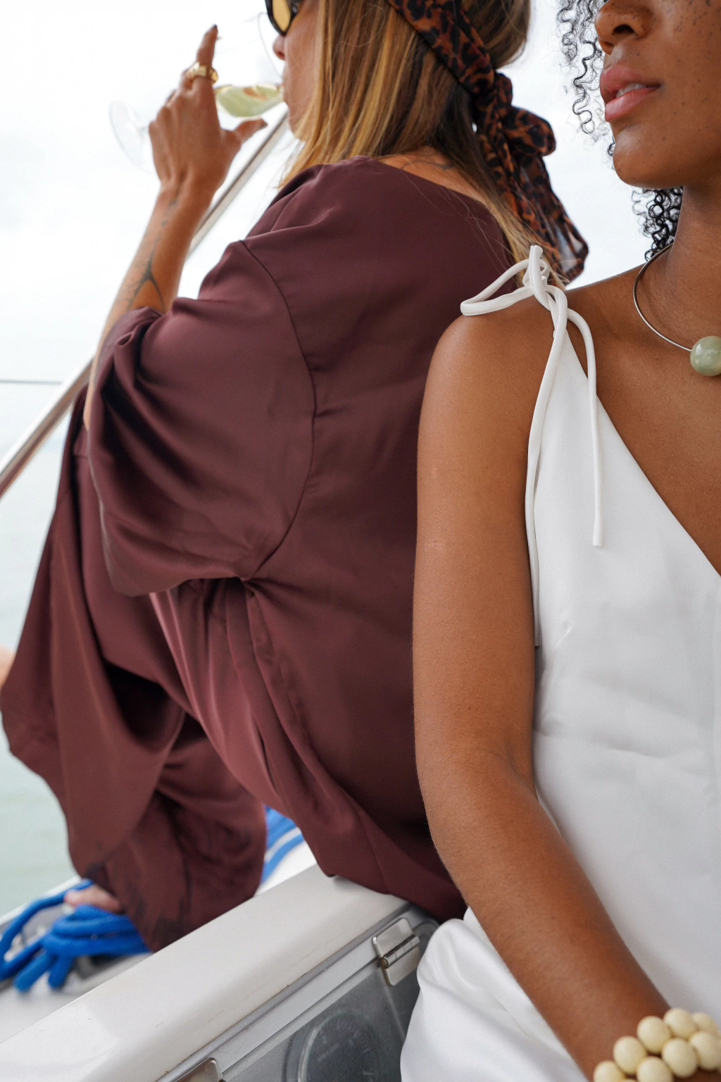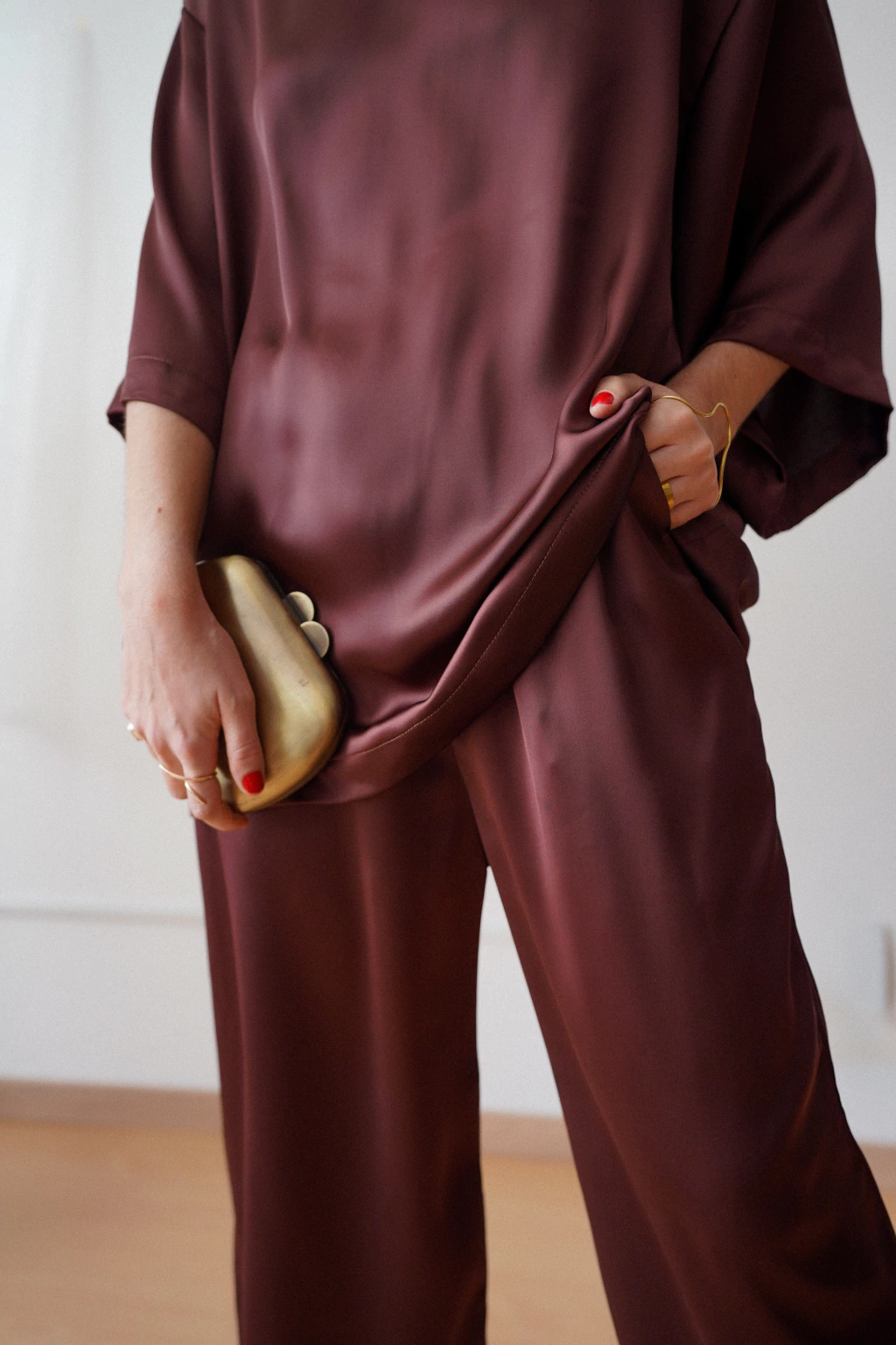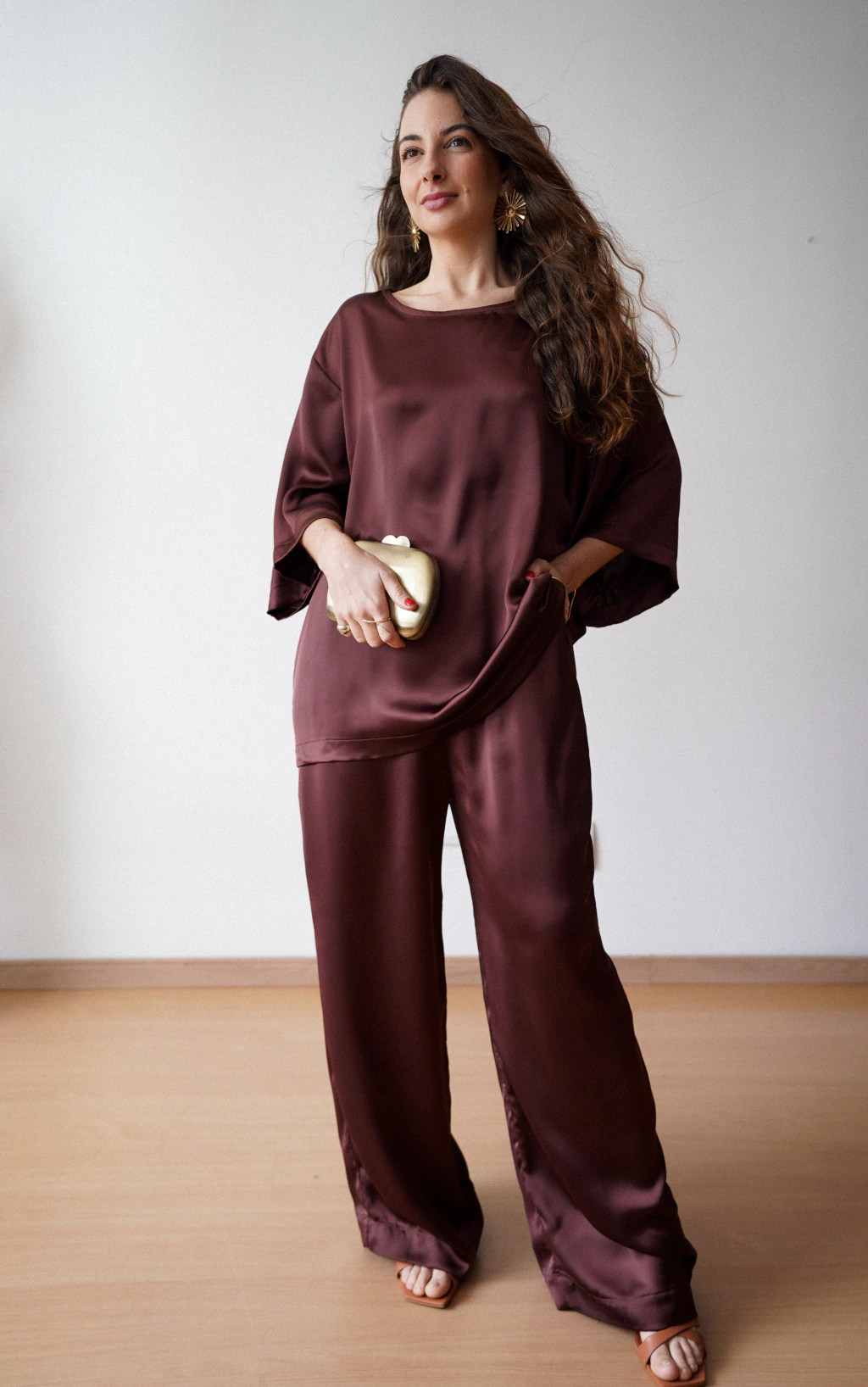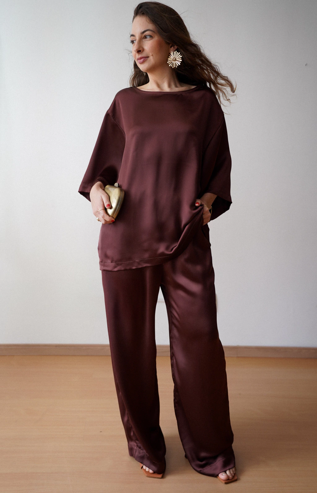 Tecido de cetim fluido, com caimento impecável, brilho sutil e toque macio.