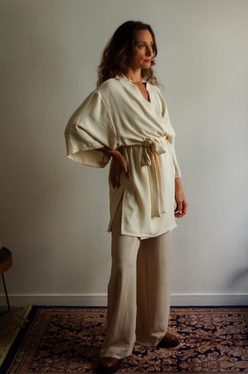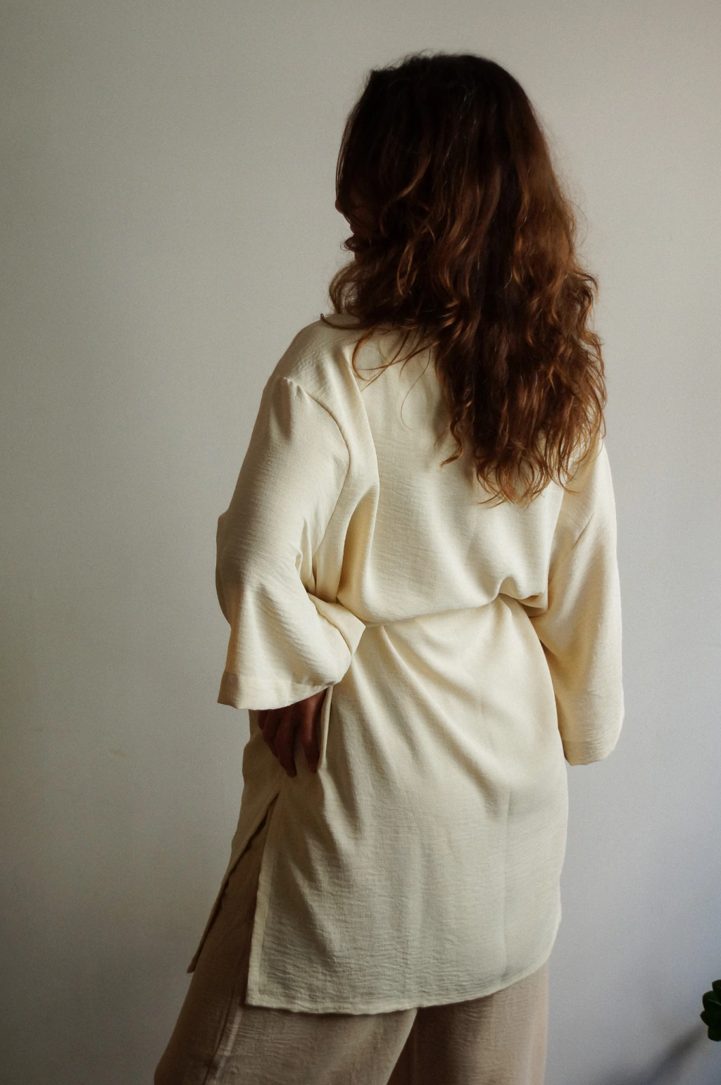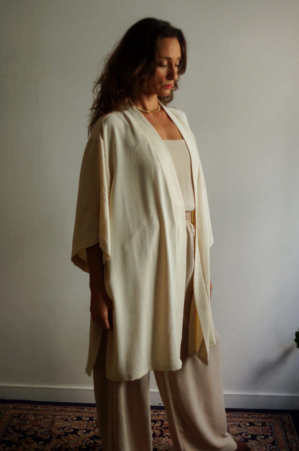 Sua textura em crepe rústico confere um toque de sofisticação, enquanto seu caimento impecável proporciona liberdade de movimento e conforto. O Kimono Classic com modelagem alongada é uma opção prática e elegante para diversas ocasiões, seja para complementar um visual casual ou dar um toque de elegância a um look mais formal. O Kimono Classic com modelagem alongada em crepe rústico é uma escolha sofisticada e versátil para complementar o seu guarda-roupa.
